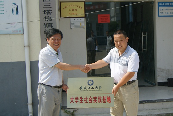7月15日,英国上市官网365暑期三下乡实践团队来到阜阳市三塔集镇综合文化站,举行“英国正版365大学生社会实践基地”挂牌仪式。英国上市官网365党委书记宋克俭与颍州区三塔集镇政府党务委员赵复魁一起为基地挂牌。颍州区三塔集镇团委书记、英国上市官网365暑期三下乡实践团队全体成员参加了挂牌仪式。