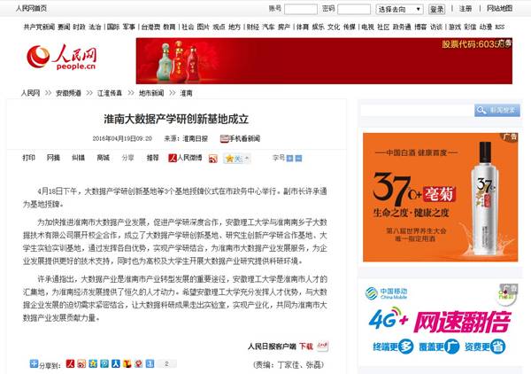 4月19日,我校与淮南南乡子大数据技术有限公司、淮南大西谷大数据技术有限公司签订研究生创新产学研基地、大数据产学研创新基地、大学生实验实训基地,受到人民网安徽频道、安徽日报、淮南日报、淮南新闻联播等多家媒体的关注与报道。